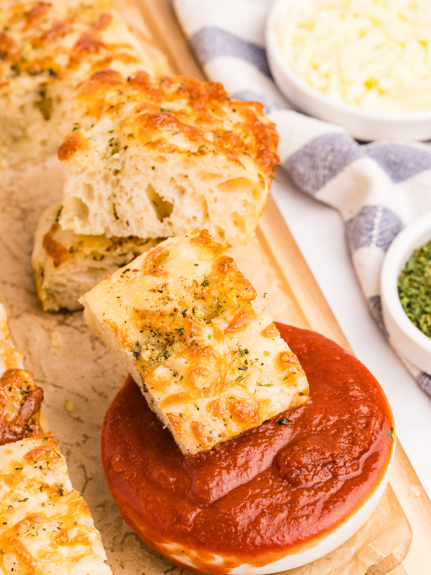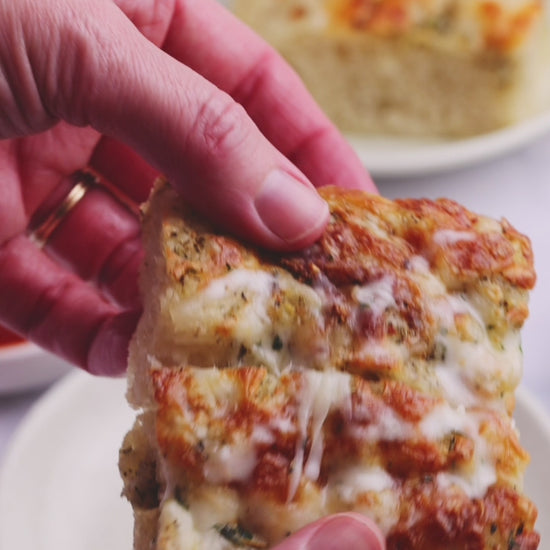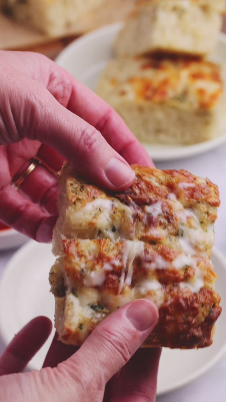 Soft, fluffy focaccia meets classic garlic bread in this easy, no-knead recipe. Infused with garlic, herbs, olive oil, and topped with melty mozzarella and parmesan, this focaccia is deeply flavorful with a golden, crisp edge and a tender, airy interior.